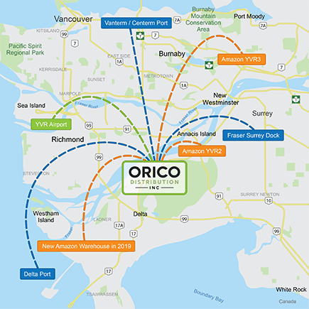 Our warehouse is located at the center of Greater Vancouver Area. The center location gives us an advantage of being more convenience and accessible to all Vancouver ports, and cost-effective for transportation.